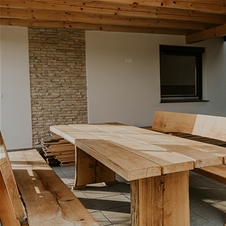 V dnevnem prostoru je krušna peč, okoli katere je postavljena velika lesena klop z jedilno mizo. Na drugi strani dnevnega prostora se nahaja raztegljiv kavč s televizijo, ki je povezana s kabelskim omrežjem. Celotna hiša pa je pokrita z WiFi signalom.