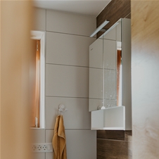 V pritličju se nahaja hodnik, iz katerega se vstopa v kopalnico, ki je opremljena s tušem, WC-jem in kopalniškim pohištvom. Kopalnica je ogrevana s talnim gretjem in električnim radiatorjem.
