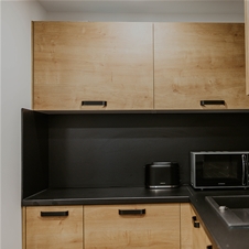 Talno ogrevana je tudi kuhinja, kjer se nahaja pomivalni stroj, indukcijski štedilnik, hladilnik z zamrzovalnikom, napa, toaster, palični mešalnik, hladilnik in vsa potrebna kuhinjska posoda.