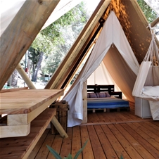 Eko šotori so oddaljeni le 100 metrov od plaže, kjer lahko uživate na 5 kilometrov dolgi prodnati plaži (modra zastava) s številnimi površinami za sončenje. Nastanitvene enote so okolju prijazne, saj ne uporabljajo plastike. V šotorih lahko najdete hladilnik, posodo, dodatne brisače, posteljnino in manjši štedilnik. Sanitarije se nahajajo tik za šotorom, parkirišče pa ob vsakem šotoru. Domače živali so več kot dobrodošle.