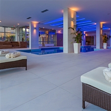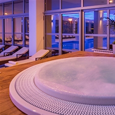 Wellness vabi z notranjim bazenom z morsko vodo, hidromasažnim bazenom, finsko in bio finsko savno, turško kopeljo in relax cono s pogledom na sredozemski vrt.