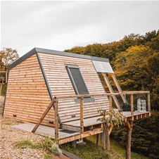 Premišljena izvedba vhodnih vrat daje možnost, da odprete celotno steno objekta in tako dejansko spite v naravi. Pogled s terase nudi neprecenljivo kuliso gozda pred vami, ki vas bo zagotovo napolnila z mirom in optimizmom.