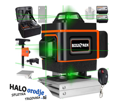 - Ponudba vsebuje: 1x akumulatorski gradbeni laserski nivelir s 16 zelenimi laserskimi linijami (8 navpičnih in 8 vodoravnih) + stenski nosilnik in torba + 2x baterija 1500mAh.