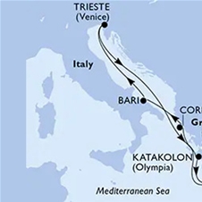 - Ponudba vsebuje: 10-dnevno skupinsko križarjenje z ladjo MSC Fantasia Trst-Olympia-Atene-Izmir-Istanbul-Krf-Bari-Trst za 1 osebo: termin 15.-24.9.2026 + 9x nočitev z razširjenim polnim penzionom v času križarjenja (zajtrk, kosilo, večerja, prigrizke, polnočni bife in gala večerja) + voda, kava in čaj čez dan iz avtomatov v samopostrežnih restavracijah, ob zajtrku tudi sokovi + namestitev v notranji kabini Fantastica (minimalna zasedenost kabine: 2 odrasli osebi; maksimalna kapaciteta kabine: 4 odrasle osebe) + pristaniške pristojbine + zabavni večerni program, predstave in animacija v organizaciji ladjarja MS + uporaba bazenov, masažnih kadi in fitnes centra ter športne aktivnosti + slovensko/hrvaški predstavnik in organizacija ter izpeljava potovanja + brezplačen peš voden izlet Barija.