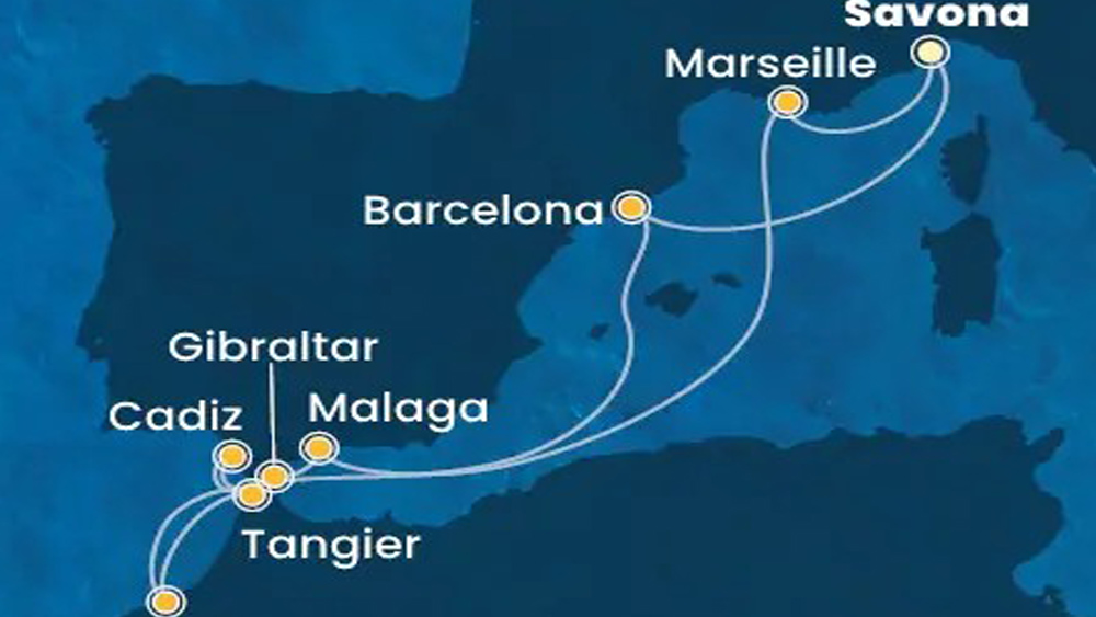 - Ponudba vsebuje: 11-dnevno skupinsko križarjenje z ladjo Costa Fascinosa Savona-Barcelona-Cadiz-Tangier-Casablanca-Gibraltar-Malaga-Marseille-Savona za 1 osebo + termin 5.-15.11.2026 + 10x nočitev z razširejnim polnim penzionom v času križarjenja (zajtrk, kosilo, večerja in prigrizki - okusne jedi, ki jih je kreiral kuharski mojster Bruno Barbieri, s 7. Michelinovimi zvezdicami) + voda, kava in čaj čez dan iz avtomatov v samopostrežnih restavracijah, ob zajtrku tudi sokovi + namestitev v notranji kabini (minimalna zasedenost kabine: 2 odrasli osebi; maksimalna kapaciteta kabine: 4 odrasle osebe) + pristaniške pristojbine + zabavni večerni program, predstave in animacija v organizaciji ladjarja Costa + uporaba bazenov, masažnih kadi in fitnes centra ter športnih aktivnosti + slovenski/hrvaški predstavnik in organizacija ter izpeljava potovanja + brezplačen peš voden ogled mesta Malaga.