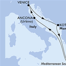 Ancona ponuja ene najbolj čistih plaž, zato je že nekaj let zapovrstjo nosilka mednarodnega priznanja Modre zastave. Mesto ponuja nekaj zgodovinskih stavb, vendar so le te vpete v moderno središče mesta, med njimi je tudi katedrala sv. Ciriaca. Predviden prihod ladje je ob 14:00 uri, odhod pa ob 20:03 uri.