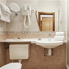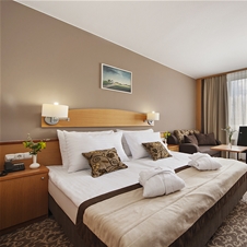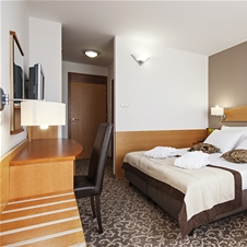 Udobna dvoposteljna soba z ležiščem širine 180 cm ali ločenima ležiščema širine 90 cm s pogledom na park. V sobi (20 m2) je kopalnica s kadjo s tušem in WC-jem in pisalna miza.