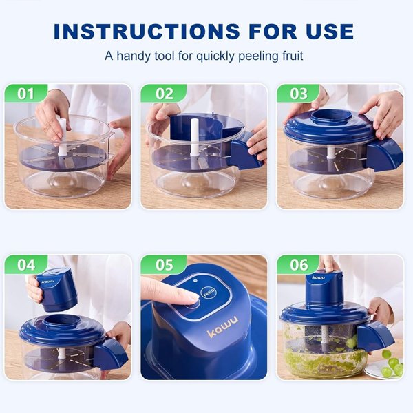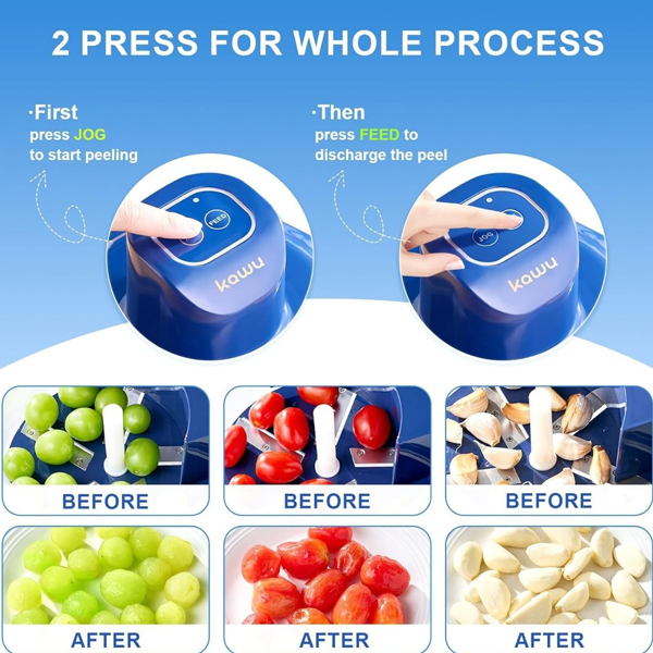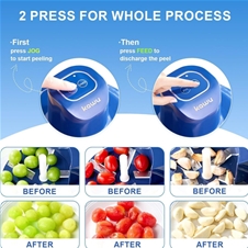 Uporaba je izjemno preprosta: z enim gumbom zaženete postopek lupljenja, z drugim pa enostavno sprostite vsebino. Ker je brezžičen, ga lahko uporabljate kjerkoli – po polnjenju ne potrebuje kabla in omogoča popolno svobodo pri delu v kuhinji.