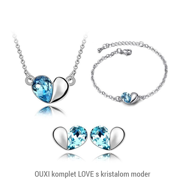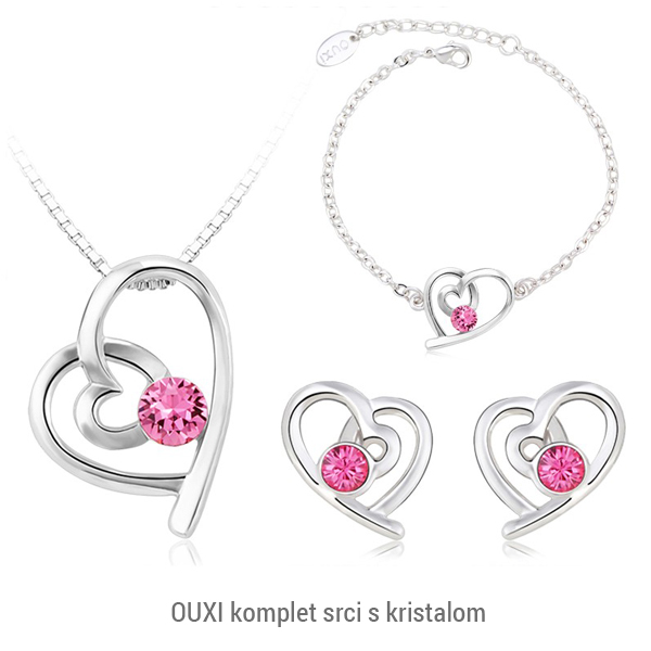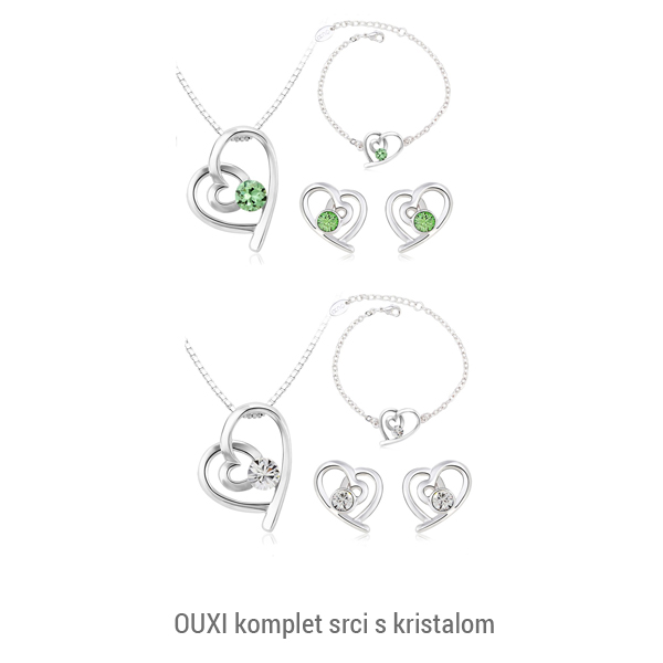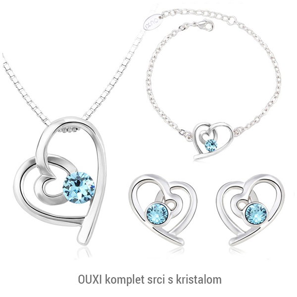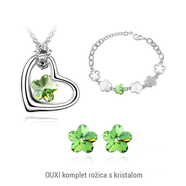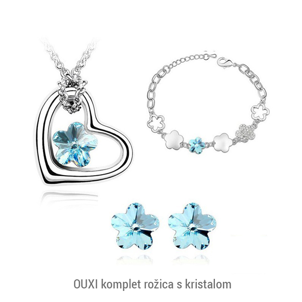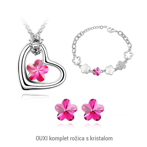 Klasika! - 65 % na čudovit 3-delni set nakita OUXI (verižica + uhani + zapestnica) po izbiri: 1.) komplet rožica s kristalom (vijoličen, roza, moder ali zelen) ALI 2.) komplet srci s kristalom (moder, roza, bel ali zelen) ALI 3.) komplet LOVE s kristalom! Poštnina je brezplačna!