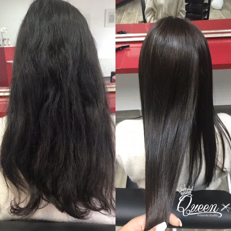 Potek: Sam postopek traja 2-3 ure, in enim postopkom dobite pozdravljen las za naslednje 4 mesece. Potem lahko postopek ponovite, ni pa pogoj. Po tretmaju je potrebno uporabljati šampon brez sulfatov.
