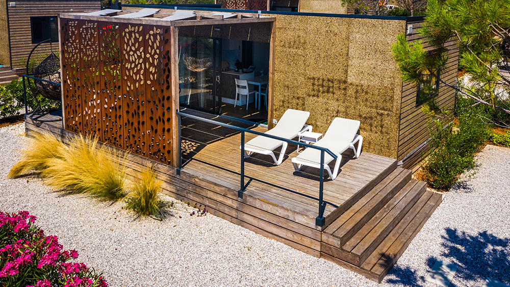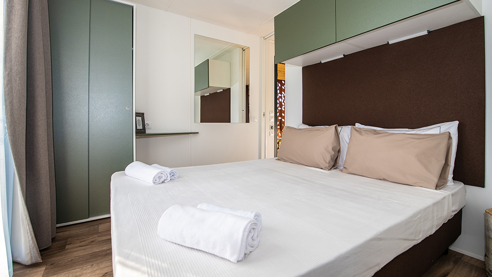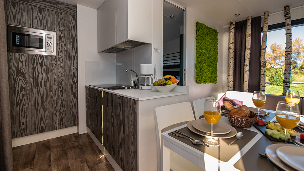 Green hiška je velika približno 37m2. Na voljo sta dve spalnici, ena z zakonsko posteljo in ena z ločenima posteljama. Na voljo je splano bivalni prostor z raztegljivim kavčem, ki služi kot pomožno ležišče ter popolnoma opremljena kuhinja. Mobilna hiška ima tudi klimatsko napravo, LCD TV, sef in dve kopalnici s tušem ter sušilcem za lase. Na voljo je tudi terasa velika približno 25m2.