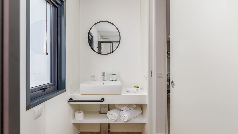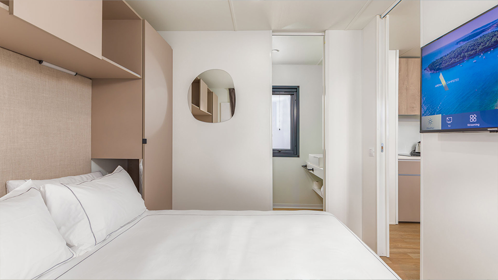 Mobilna hiška je velika približno 40 m2. Na voljo sta dve spalnici, ena z zakonsko posteljo in lastno kopalnico in ena z pogradom ter lastno kopalnico. Na voljo je splano bivalni prostor s kavčem ter popolnoma opremljena kuhinja ter kopalnica. Mobilna hiška ima tudi klimatsko napravo, LCD TV ter sef. Na voljo je tudi terasa velika približno 17m2.