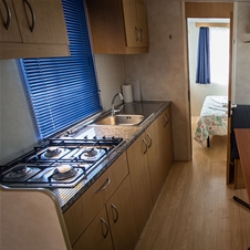Mobilna hiška je velika približno 24 m2. Na voljo sta dve spalnici, ena z zakonsko posteljo in ena z dvema ločenima posteljama ter pomožnim ležiščem. Na voljo je splano bivalni prostor, popolnoma opremljena kuhinja ter kopalnica. Mobilna hiška ima tudi klimatsko napravo, LCD TV ter sef. Na voljo je tudi terasa velika približno 12m2.