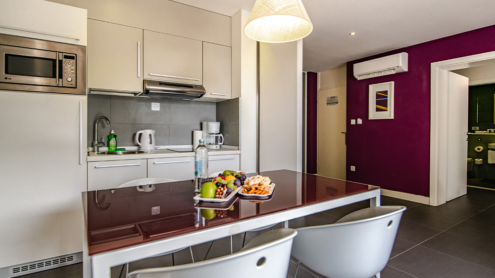 Apartma je velik približno 35 m2 in ima dve splnici, eno z zakonsko posteljo in eno z ločenima posteljama ali pogradom ter spalno bivalni prostor s kavčem in popolnoma opremljeno kuhinjo. Na voljo je kopalnice s tušem in sušilcem za lase, TV, telefon ter sef. Apartma ima balkon.