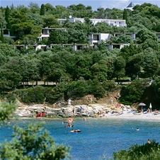 Kamnito pordnate plaže se nahajajo približno 100m od naselja. Plaže imajo naravno senco zaradi borovega gozda, ob doplačilu so na voljo ležalniki in senčniki. Na plažah so na voljo tudi garderobe za preoblačenje.