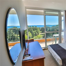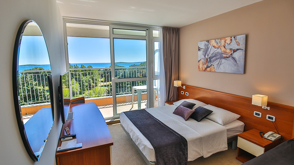Dvoposteljna soba je velika približno 19 m2 in ima zakonsko posteljo. Na voljo je kopalnica s tušem in sušilcem za lase, TV, telefon ter sef. Soba ima možnost 1 pomožnega ležišča. Soba ima balkon na morsko stran.