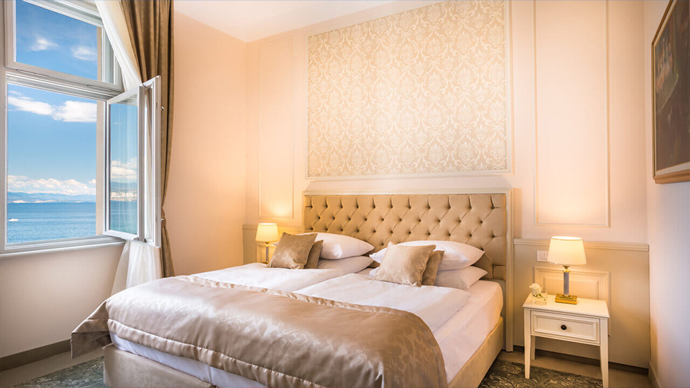 Superior dvoposteljna soba s pogledom na morje je velika približno 18-20 m2 in ima zakonsko posteljo. Na voljo je kopalnica s prho ali kadjo, sušilec za lase, internet, SAT TV, telefon, pisalna miza. Vse sobe so klimatizirane.