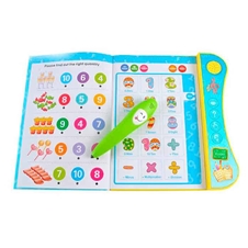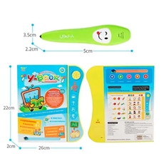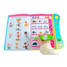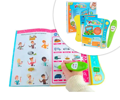Uporaba: primerno za otroke od 3. leta dalje. Potrebuje 5 AAA baterij (niso vključene). 3 AAA baterije vstavite v knjigo, 2 pa v svinčnik. Knjiga ima 20 strani z različnimi vsebinami. Na levi strani najdete naloge, kjer otrok uporablja svinčnik. Svinčnik z barvo in zvokom opozori, ali je odgovor pravilen ali napačen. Na desni strani knjige se nahaja različna vsebina, kjer otrok posluša besede, zgodbice ali pesmice. Preden začnete uporabljati stran morate pritisniti gumb Start. Na gumbu Switch knjigo prižgete in ugasnete. Na isti strani lahko prilagajate tudi glasnost zvoka. Primeri nalog, kjer otrok uporablja svinčnik (leva stran): prepoznavanje ure, otrok prešteje predmete in označi številko, otrok loči med sadjem in zelenjavo, prepoznavanje živali, prepoznavanje pripomočkov različnih poklicev, prepoznavanje obrisev, barv in dolžine na ravnilu. Primeri aktivnosti za učenje besed in poslušanje pesmic ter zgodbic: učenje črk in števil, učenje različnih besedišč, kot so živali, hrana, prevozna sredstva, družinski člani ter poslušanje številnih različnih pesmic, rim in kratkih zgodbic v angleščini.