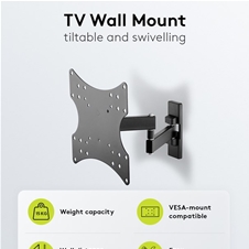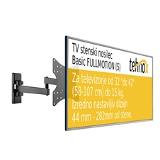- Ponudba vsebuje: 1x kvaliteten TV nosilec Basic FULLMOTION (S). Priporočena velikost zaslona S (58-107 cm / 23-42"), največja obremenitev do 15 kg.