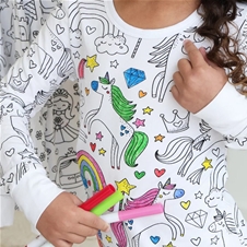 • Ponudba vsebuje: 1x  otroško bombažno pižamo, ki jo lahko pobarvate + 12 flomastrov za tkanino v različnih barvah. Na voljo 2 modela: samorogi ali dinozavri, v velikosti za 3-4 leta ALI za 5-6 let.