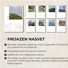 - Ponudba vsebuje: 1x personalizirani stenski koledar 2026 (format A3 + žična vezava), s fotografijami po želji (12 fotografij) v tiskarni Cyber print shop: Hala A, BTC City v Ljubljani. Izbirate lahko med 5 različicami stenskega koledarja (prikaz v galeriji slik).