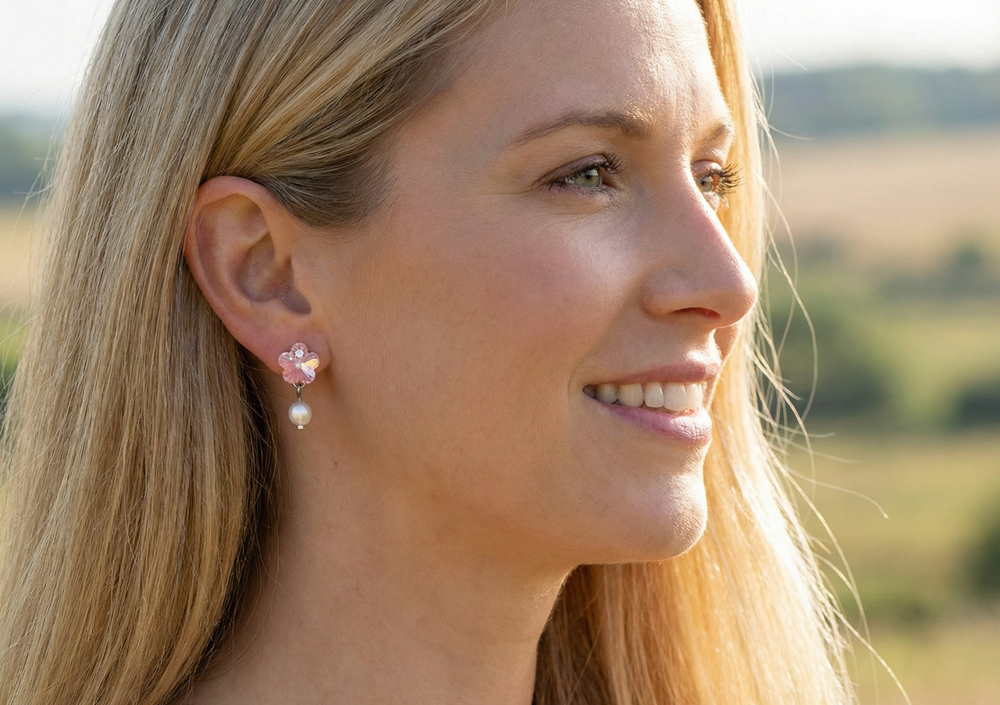 Unikaten nakit za modne poznavalke! -55% popust na par ročno izdelanih uhanov Pink Flower s Swarovski kristalom!