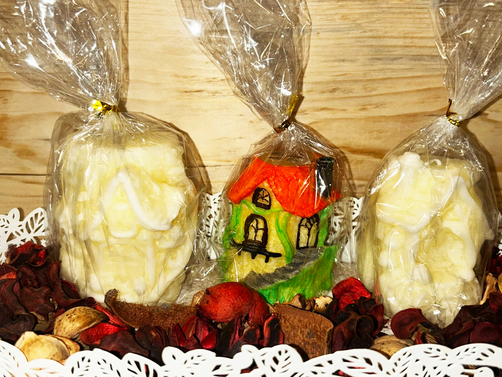 Skulptura! SUPER CENA za dekorativno dišečo svečo v obliki hiške iz naravnega voska po izbiri! Na voljo s poslikavo ali brez ter v dišavi: vanilija ali jasmin! Ročno izdelana, opremljena z bombažnim stenjem za enakomerno in prijetno gorenje! Poštnina je brezplačna!