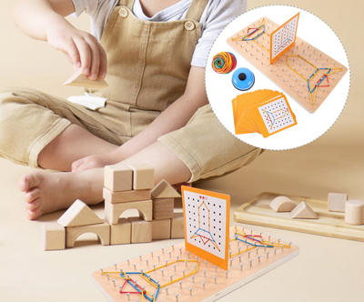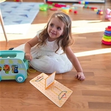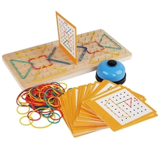 Odlična izbira za zabavo in učenje hkrati! 2 tekmovalca tekmujeta, kdo bo z gumicami na leseni plošči hitreje sestavil motiv narisan na kartici. Kdor prvi konča, pozvoni na priložen zvonček.