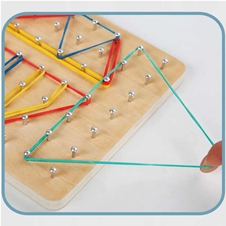 Uporaba: 2 tekmovalca tekmujeta, kdo bo z gumicami na leseni plošči hitreje sestavil motiv narisan na kartici. Kdor prvi konča, pozvoni na priložen zvonček. Primerno za otroke in odrasle.