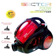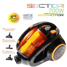 Da bo vaš dom čist in brez prahu ter umazanije, vam predstavljamo najnovejši Multiciklonski sesalnik Sector 4002, ki spada v zadnjo generacijo ciklonskih sesalcev. Navdušil Vas bo visoko zmogljiv motor, (nova generacija - ECO motor). MULTICIKLONSKI SESALNIK ima t.i. mehak zagon motorja z močjo 700W, (ECO visoko zmogljivi motor 3x), nominalna moč enaka moči motorju 2200W, moč motorja je nastavljiva z vrtljivim gumbom. Energijski razred A! Četrta generacija ciklonskega sistema popolnoma ločuje prah od zraka in zmanjšuje obrabo H.E.P.A. filtra. Pohvali se lahko s 30 % manjšo porabo pri isti moči sesanja za prilaganje različnim površinam (trda tla, preproge, zavese). Sesalniku ne manjka niti termostat proti pregrevanju motorja. Zahvaljujoč mehkim kolesom ga lahko brezskrbno uporabljate tudi na občutljivejših tleh. Ponaša pa se tudi z motorjem z visoko učinkovitostjo, sesalno močjo 200 W.