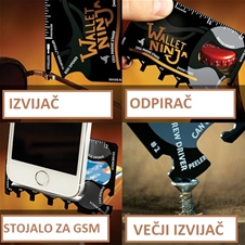 - Ponudba vsebuje: 1x Wallet Ninja edinstveni, univerzalni pripomoček iz nerjavečega jekla, ki združuje kar 18 orodij:6 viličastih ključev (št. 2, 4, 8, 10, in 12), 4 izvijače (križnega, ploskega in finomehanskega za očala) in 8 priročnih orodji (odpirač za konzerve, nožek, 2x ravnilo, stijalo za mobilni telefon in lupilnik za sadje).