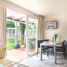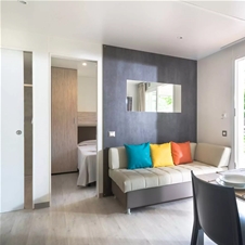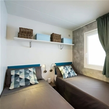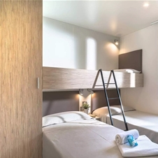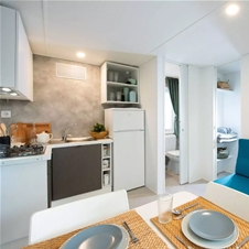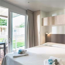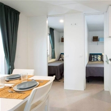 Mobilne hiške PREMIUM z modernim dizajnom za 5 oseb + 1 pomožno ležišče: 2 spalnici, ena z zakonsko posteljo (160 × 200 cm) n ena z pogradom in eno posteljo (75 × 200 cm). V hiški tudi dnevna soba s televizijo in raztegljivim kavčem, popolnoma opremljena kuhinja s štedilnikom, hladilnikom, lonci, priborom, mikrovalno pečico in mizo, dve kopalnici z WC-jem in tušem, lesena terasa z vrtno mizo in stoli.