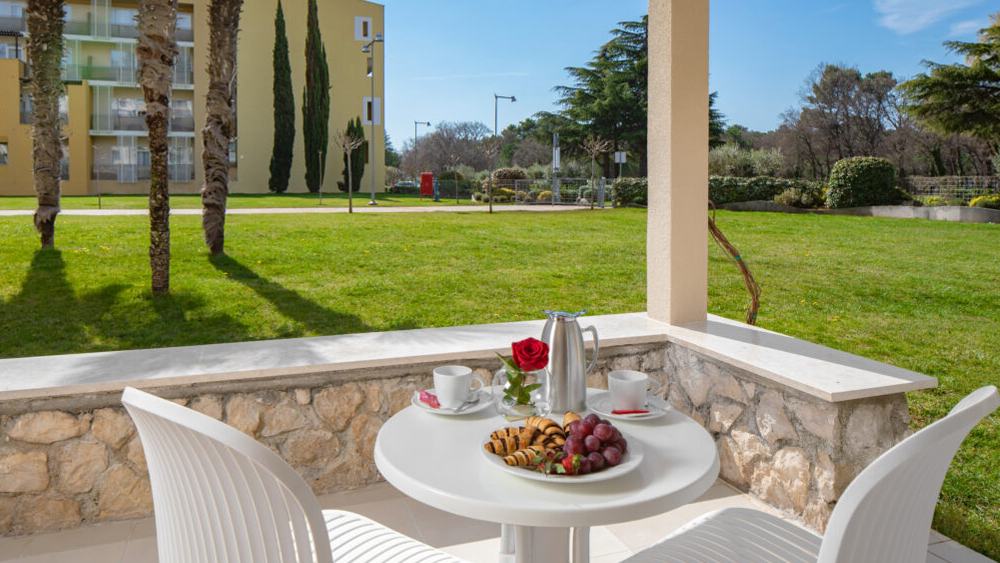 - Ponudba vsebuje: počitnice za 2 osebi v Residence Garden Istra 4* Plava Laguna v Umagu: 1x nočitev s polpenzionom v klasični dvoposteljni sobi z balkonom in pogledom na park z možnostjo 1 pomožnega ležišča (maksimalna kapaciteta sobe: 2 odrasli osebi in 1 otrok do 11,99. leta) + pijača dobrodošlice (17.7.- 11.9.2026) + gala večerja enkrat tedensko (17.7.- 11.9.2026) + pijača ob večerji: sok, voda, namizno belo in rdeče vino, točeno pivo (17.7.-26.9.2026) + all inclusive za otroke od 4. do 11,99. leta: kosilo, sladoled, pijača med 12-17ih (17.7.-26.9.2026) + uporaba zunanjega kompleksa bazenov na več nivojih s slapovi in različnimi atrakcijami in uporaba + zunanjega otroškega sladkovodnega bazena (glede na vremenske razmere) + uporaba vodnega parka z vodnim igriščem in tobogani (17.7.-15.9.2026) + kopalne brisače (s plačilom varščine) + ležalniki in senčniki na bazenu in plaži (glede na razpoložljivost) + uporaba fitnesa + brezplačna uporaba igrišča za odbojko na mivki + brezplačna shramba za kolesa + uporaba otroških igralnic, trampolin parka in Game room-a + animacija za otroke in odrasle (17.7.-14.11.2026) + brezplačen WiFi.