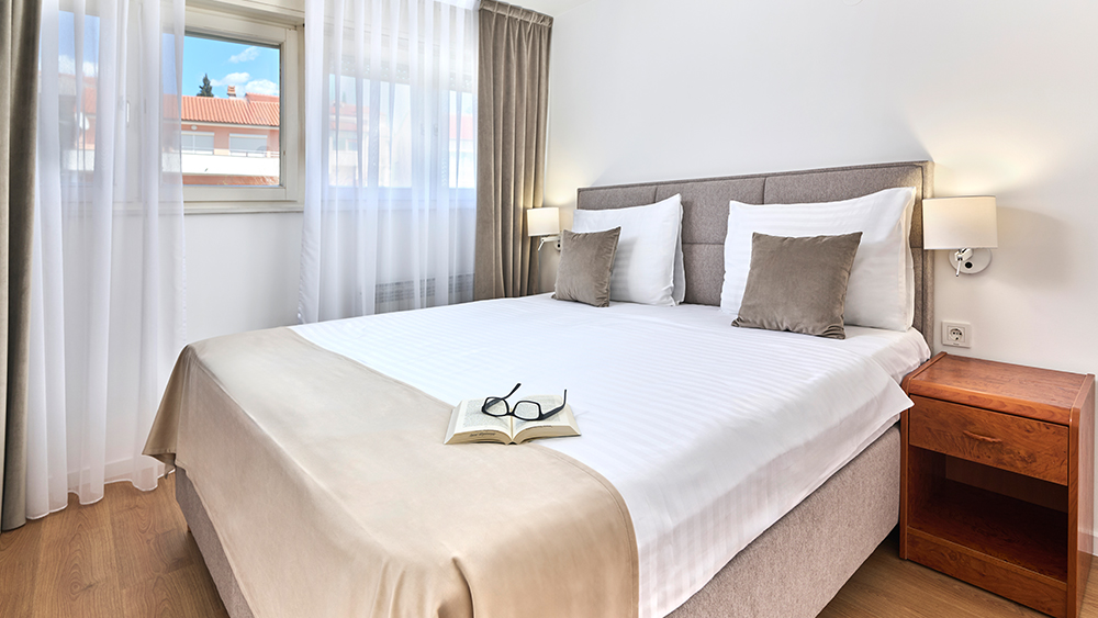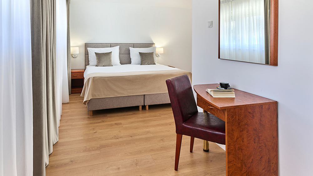Dvoposteljna soba vsebuje zakonsko posteljo ali dve ločeni ležišči, kopalnico s tušem, sušilnik za lase, toaletna kozmetika, brezplačen WI-FI, SAT TV in telefon z direktno linijo. Sobe so klimatizirane.