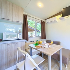Mobilne hišice se nahajajo na atraktivni lokaciji, v senci hrastovega gozda in na urejenih parcelah le 15 metrov od morja. Popolnoma opremljene in klimatizirane mobilne hišice imajo 24 m2, dve ločeni spalnici, kopalnico, WC in dnevno sobo ter popolnoma opremljeno kuhinjo. Parkirni prostor za vaš avto se nahaja ob mobilni hiški. Na veliki opremljeni terasi z vrtno garnituro lahko uživate v nepozabnih sončnih zahodih.