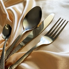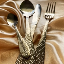 Očarajte goste s prefinjenim in prestižnim 24-delnim jedilnim priborom Dragon Scale v zlati barvi! Poseben dizajn, ki spominja na elegantne luske zmaja, združuje brezčasno eleganco, kakovost in luksuzno estetiko. Popoln je tako za vsakodnevno uporabo kot tudi za posebne priložnosti.