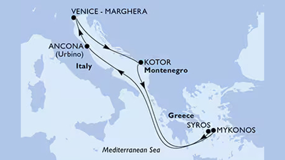 Skupinsko križarjenje z ladjo MSC Lirica Benetke-Kotor-Mykonos-Siros-Ancona-Benetke z odhodom 25.4.2026: 7x nočitev s polnim penzionom za 1 osebo v zunanji kabini z oknom Fantastica OM1 (palube 7-8) + pristaniške pristojbine + zabavne prireditve ter animacija!
