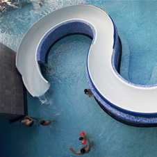 Bazenski kompleks Wellnessa Živa obsega šest bazenov in notranji tobogan s pogledom na Blejsko jezero.