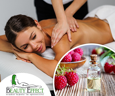 - Ponudba vsebuje: 1x 45-minutno masažo Sladki dotik maline za 1 osebo v studiu lepote in sprostitve Beauty Effect: masaža celega telesa z aromatičnim oljem maline! Počasni, sprostitveni gibi bodo ublažili napetost, pregnali stres in napolnili vaše telo z energijo.