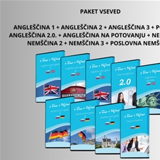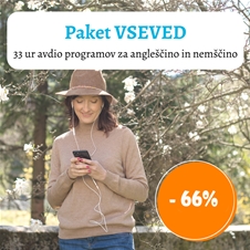 - Ponudba vsebuje: 1x online paket VSEVED za učenje angleščine in nemščine: Angleščina mim’ grede 1, Angleščina mim’ grede 2, Angleščina mim’ grede 3, Nemščina mim’ grede 1, Nemščina mim’ grede 2, Nemščina mim’ grede 3, Angleščina na potovanju in dopustu, Poslovna angleščina in Poslovna nemščina. Skupaj več kot 33 ur avdio programov + 8 PDF-prepisov (v tujem jeziku in slovenščini) + 4 BONUSI: video tečaj Angleška slovnica mim’ grede (z vajami in rešitvami), Nemška slovnica mim’ grede (z vajami in rešitvami) + USB ključek in brezplačna poštnina. Okvirna raven znanja: A1-B1 (nemščina) in A1-B2 (angleščina).
