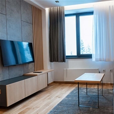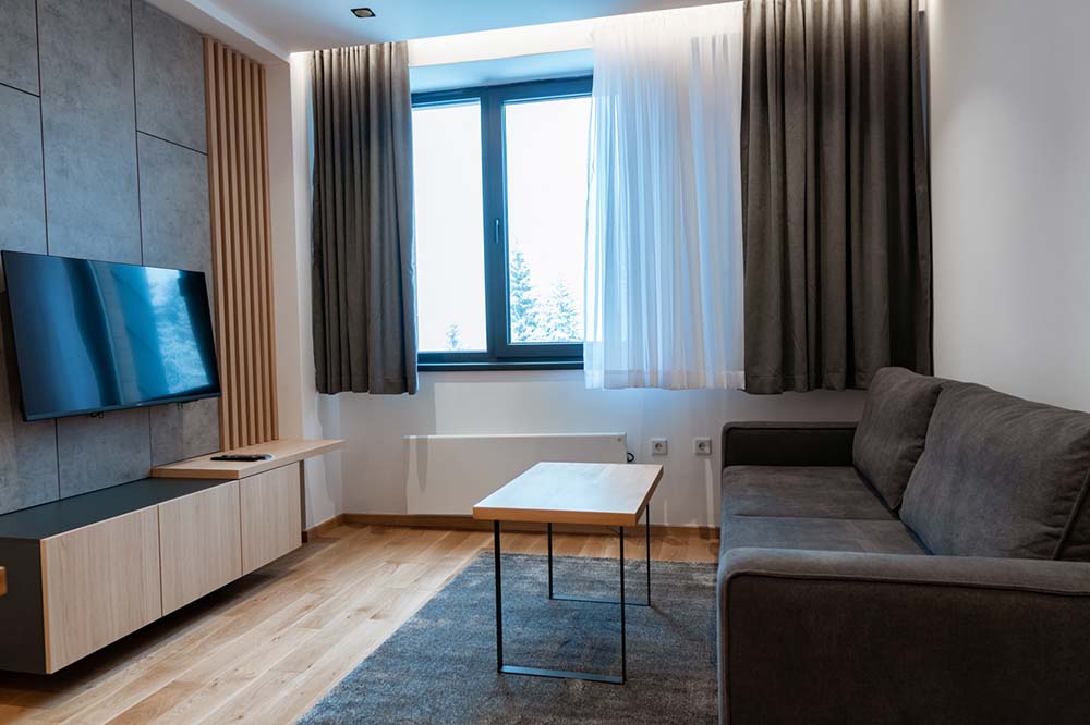 Apartmaji gostom ponujajo velike in elegantne prostore za sprostitev. Vsak je edinstvena izkušnja, pa če potujete sami, v paru ali z družino. Vsi apartmaji imajo spalnico s francosko posteljo ali dvema ločenima posteljama, dnevni prostor, polno funkcionalno kuhinjo s posodo in indukcijsko ploščo z napo. V dnevnem prostoru je ploski TV s kabelskimi kanali, po celotnem objektu, vključno z apartmaji, pa je na voljo brezplačen Wi-Fi. Vsak apartma ima lastno kopalnico z moderno tuš kabino, udobno straniščno školjko in praktičnimi omaricami za osebne predmete. Gostom so na voljo tudi mehke brisače in kopalni plašči.
