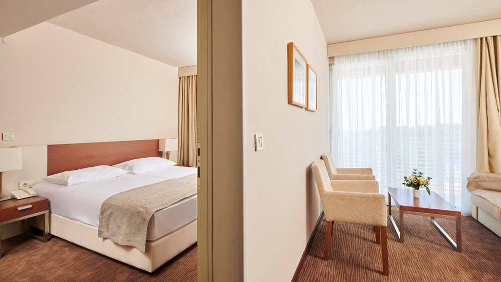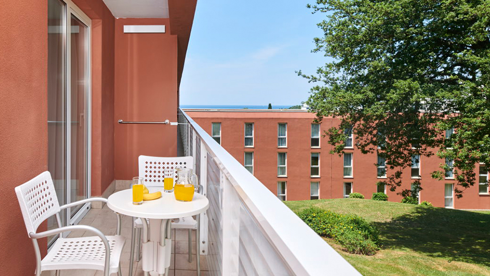 Suita z balkonom je velika približno 34 m2 in ima spalnico z združenima ležiščema ter kopalnico z banjo. Na voljo je dnevni prostor z raztegljivim dvosedom, ki služi kot dodatno ležišče, televizor, klimatska naprava, WiFi, sušilnik za lase, telefon in sef.