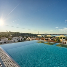 Na strešni terasi se nahaja eleganten bazen z udobnimi ležalniki, kjer se gostje lahko sprostijo in uživajo v čudovitem razgledu na Rovinj.