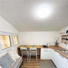 Mobilna hiška je razdeljena na dva apartmaja.