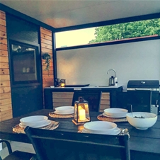 Mobilna hiška Laguna ponuja zasebno teraso, popolnoma opremljeno kuhinjo ter zunanjo kuhinjo, klimatiziran prostor ter hiter dostop do čudovite peščene plaže.