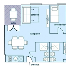 - 1 dvoposteljna soba, 1 soba z ločenima posteljama in dnevna soba z raztegljivim kavčem