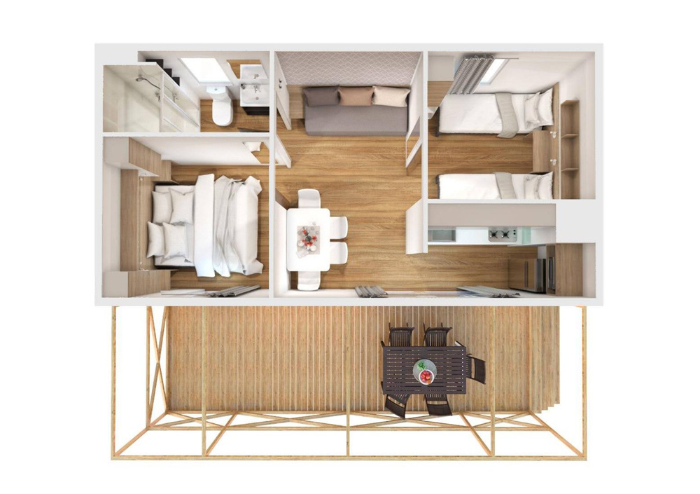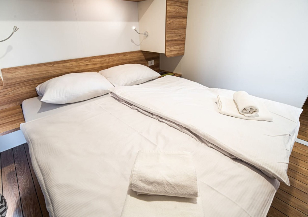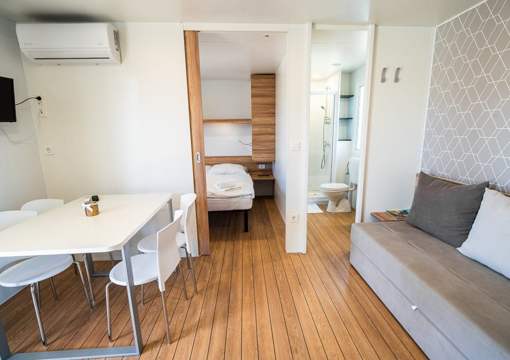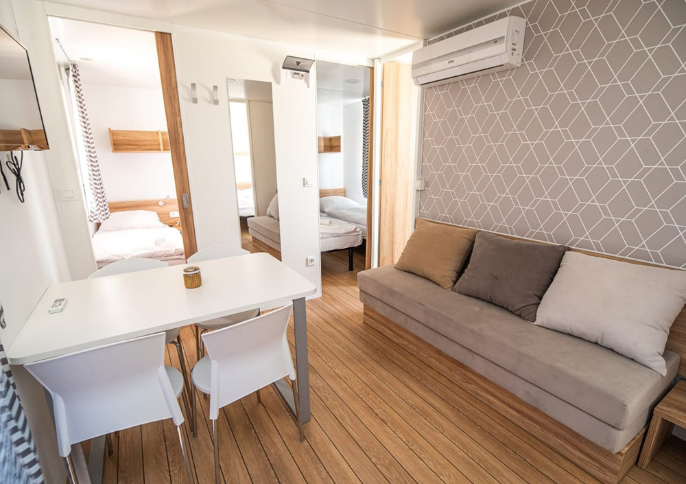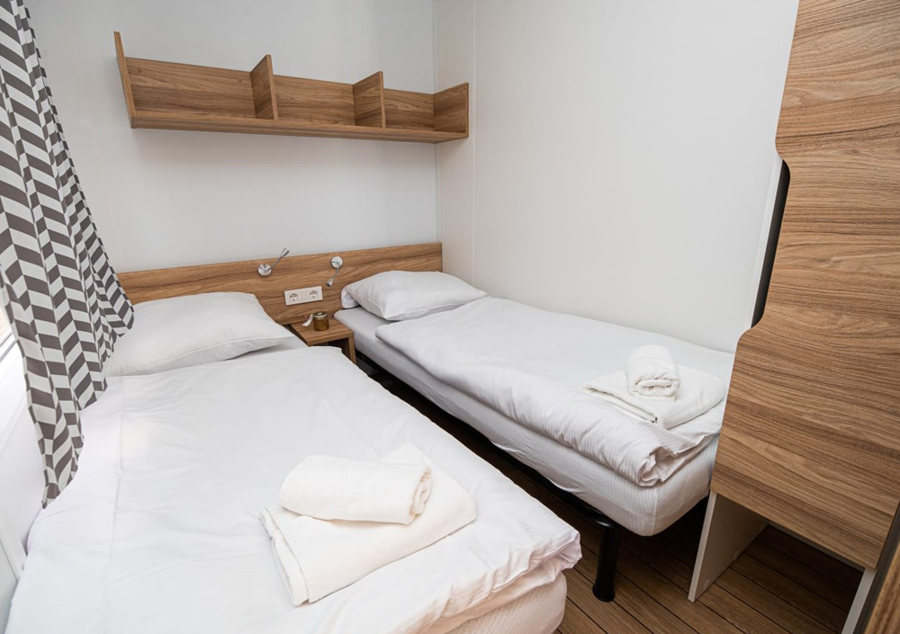 Mobilna hiška nudi prijetno in funkcionalno bivanje za udoben oddih. V hiški sta dve ločeni spalnici, ki zagotavljata dovolj zasebnosti in udobja za do štiri osebe. Na voljo je tudi posteljnina, zato je vaše bivanje brez dodatnih skrbi.