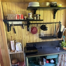 Opremljena mini kuhinja s pomivalnim koritom, električnim indukcijskih kuhalnikom, mikrovalovno pečico, posodo za kuhanje, kozarci, električnim hladilnikom, italijansko kafetiero, kavnim aparatom Nescafe Dolce Gusto na kapsule in osnovnimi začimbami.