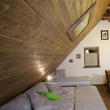 Soba za 3 osebe v mansardi je odlična rešitev za manjše družine. Velikosti okrog 30 m2 nudi sobo z zakonsko in enojno posteljo, kuhinjsko nišo in jedilno mizo, ter kopalnico.