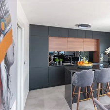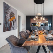 S terase vstopite v prvo nadstropje, ki je sestavljeno iz čudovite kuhinje, ki ima vse, kar potrebujete, sedežne garniture z visokimi stoli in kuhinjskega otoka. Na voljo je velika jedilna miza za 8 oseb, kjer lahko sedite, jeste in uživate, zraven pa je velika sedežna garnitura s pogledom na pametni TV s prostorskim zvokom, kjer lahko uživate v filmih in serijah po vaši izbiri.